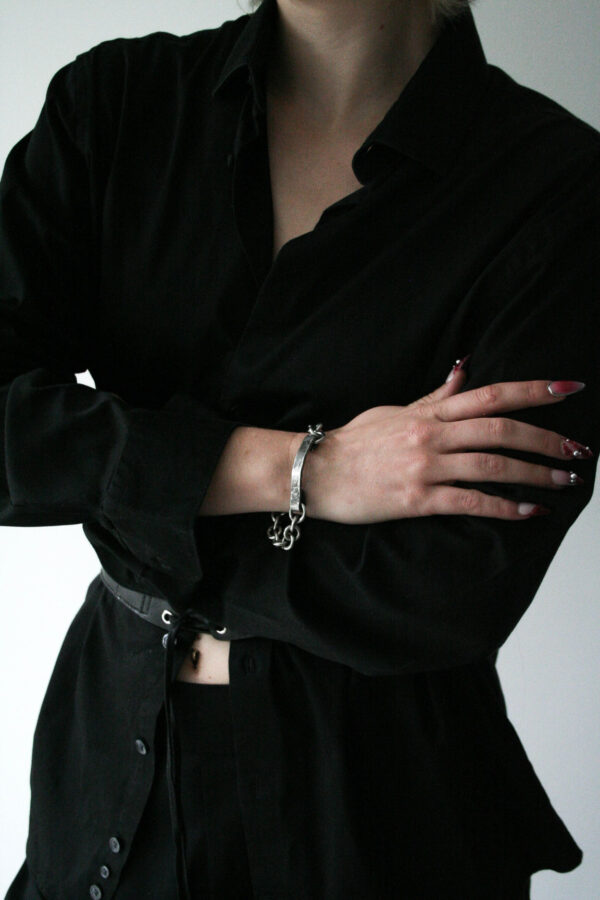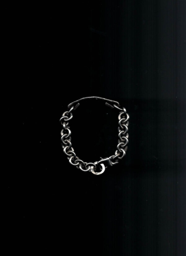 A hand-forged stainless steel bracelet. The forged stainless steel links are individually made and brazed shut. Finally the piece gets finished with a course wire brush to create the rough, weathered look.